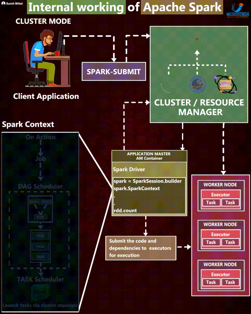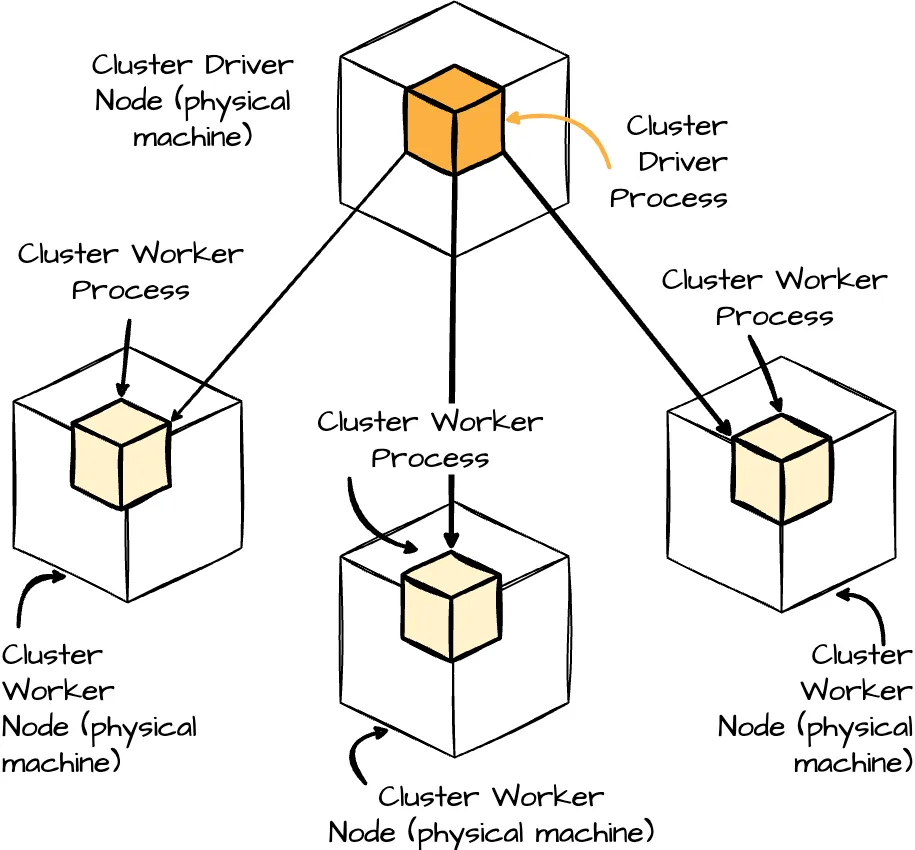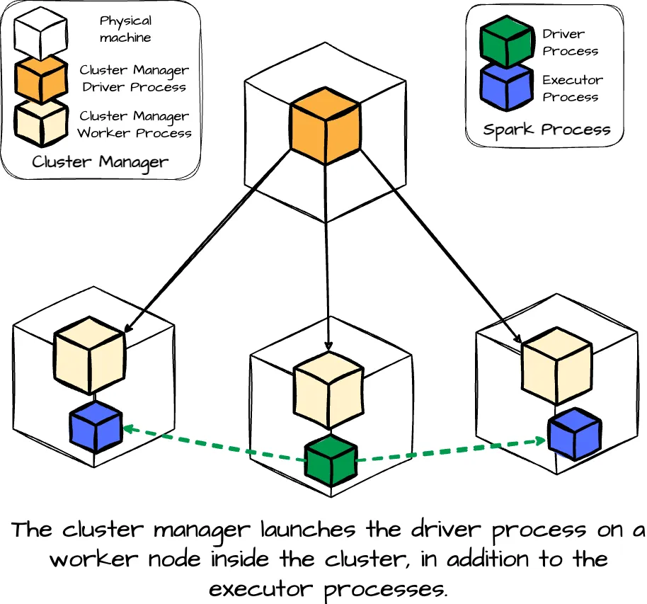 - Cluster Mode:Â In this mode, the driver process is launched on a worker node within the cluster alongside the executor processes. The cluster manager handles all the processes related to the Spark application.