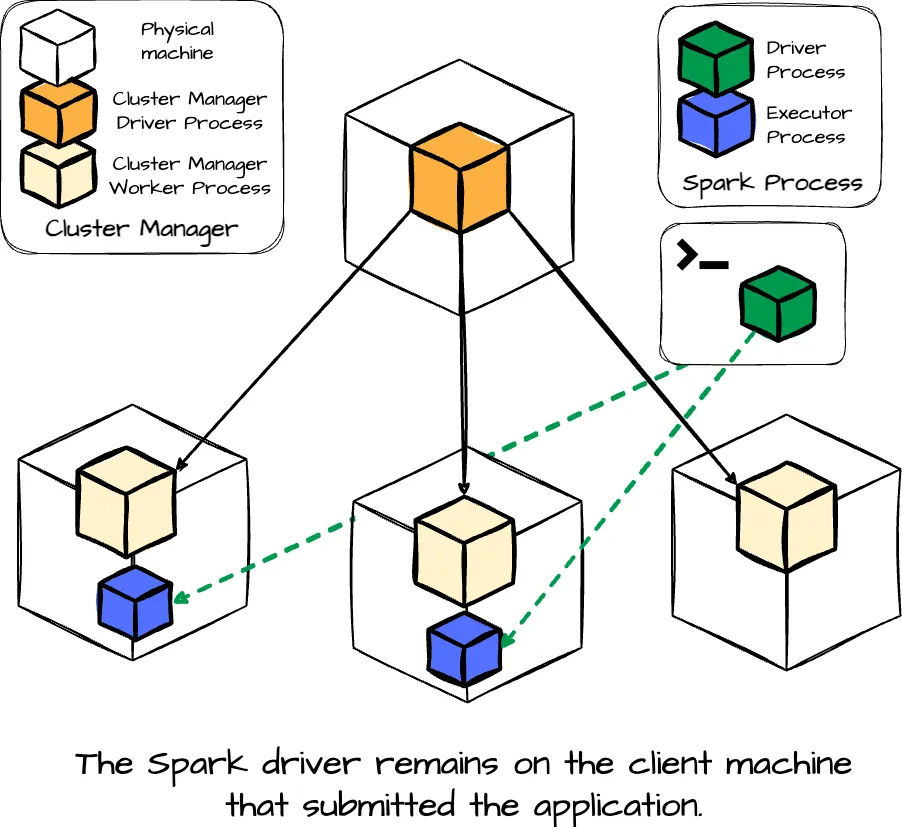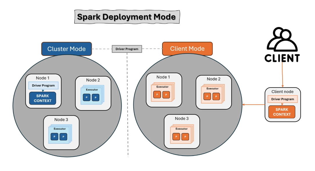 - Client Mode: The driver remains on the client machine that submitted the application. This setup requires the client machine to maintain the driver process throughout the application’s execution.