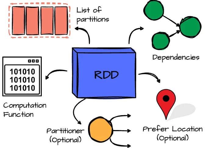 - List of Partitions:Â The RDD is divided into partitions, which are the units of parallelism in Spark.