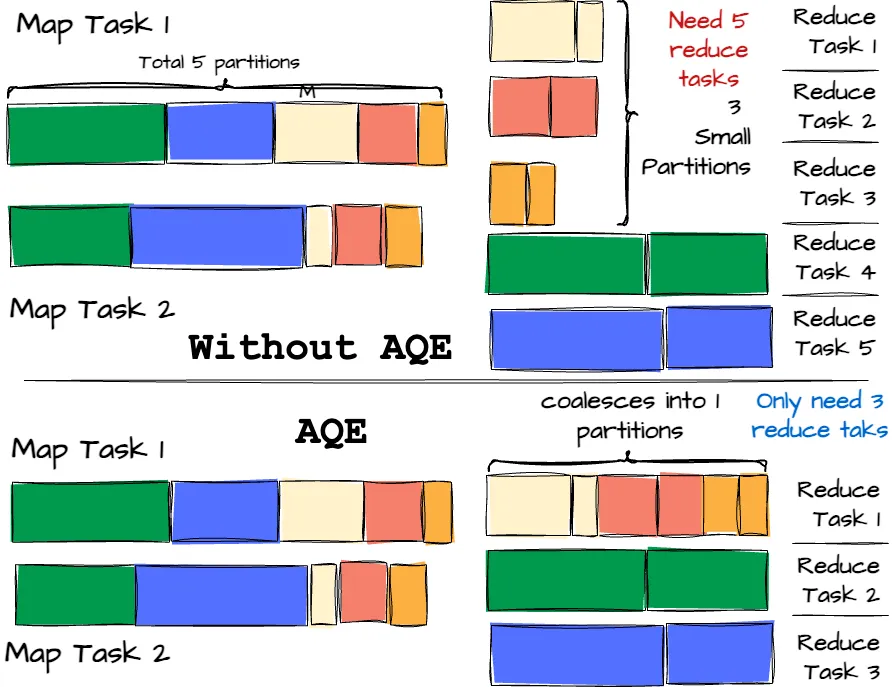 To address this, the user can start with a relatively large number of shuffle partitions and then combine smaller adjacent partitions at runtime by analyzing shuffle file statistics with the help of AQE. This approach helps balance partition sizes and improve query performance. Let’s visit the example below for a better understanding