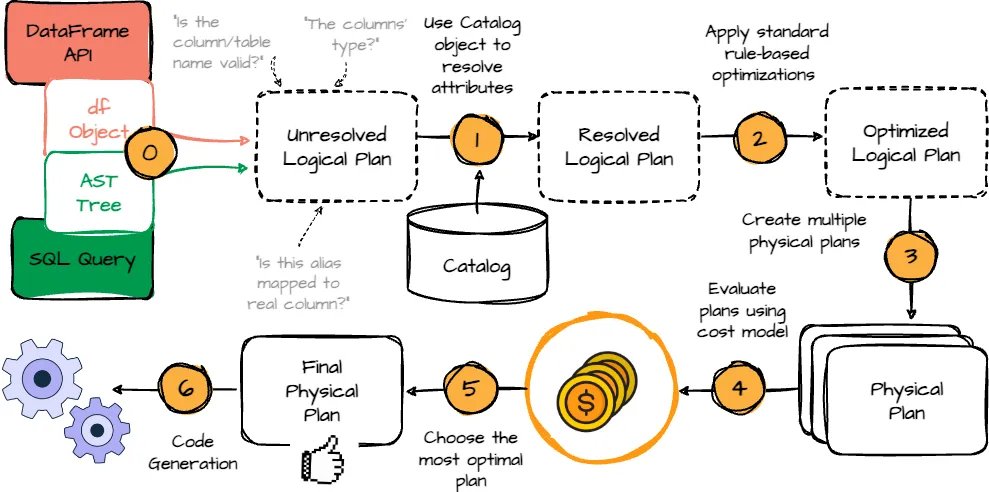 - Cost-Based Optimization (CBO): Cost-based optimization, on the other hand, uses statistical information about the data—such as table size, index selectivity, and data distribution—to estimate the cost of various execution plans. The optimizer evaluates multiple potential plans and chooses the one with the lowest estimated cost. However, it requires accurate statistics available. Essentially, Catalyst includes a general library for representing trees and applying rules to manipulate them. Developers can extend Catalyst to support desired external data sources and user-defined types