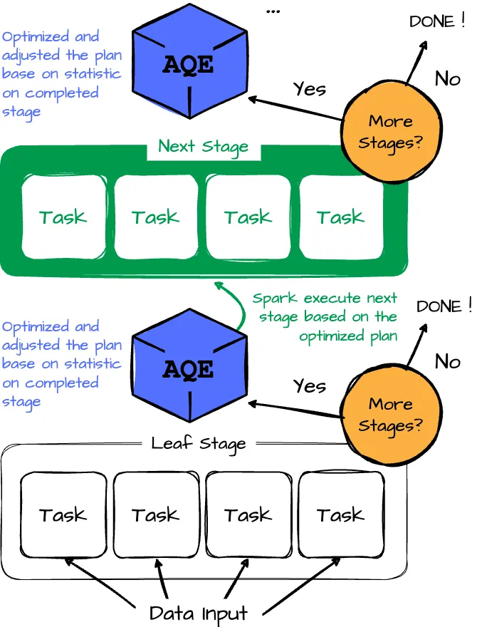 - The Adaptive Query Execution (AQE) framework starts by executing leaf stages, which do not depend on other stages. (reading data input)