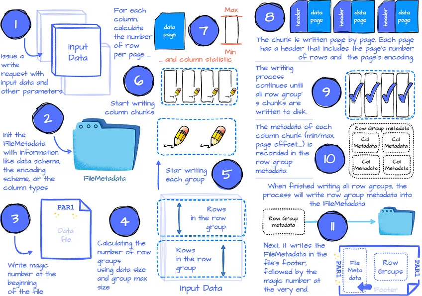 - The application issues a written request with parameters like the data, the compression scheme for each column (optional), the encoding scheme for each column (optional), the file scheme (write to one file or multiple files), custom metadata, etc.