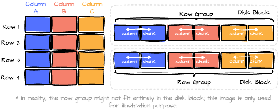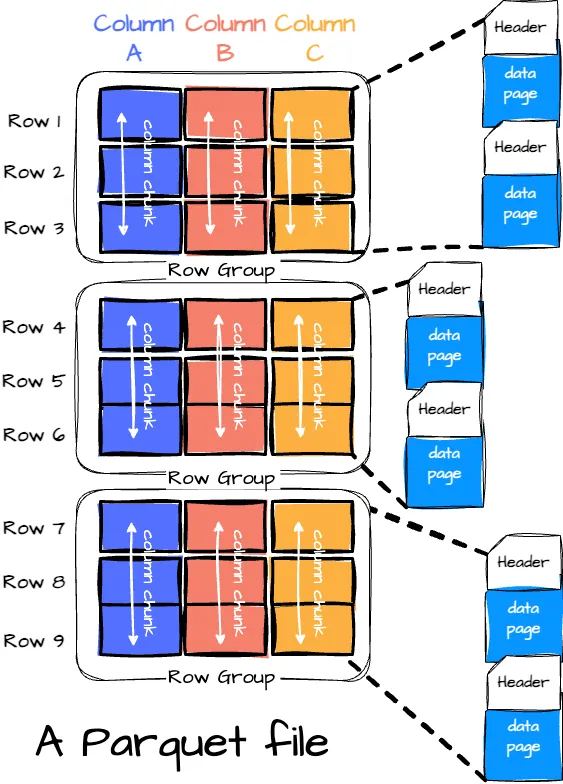 - Row Groups: Each row group contains a subset of the rows in the dataset. Data is organized into columns within each row group, each stored in a column chunk.