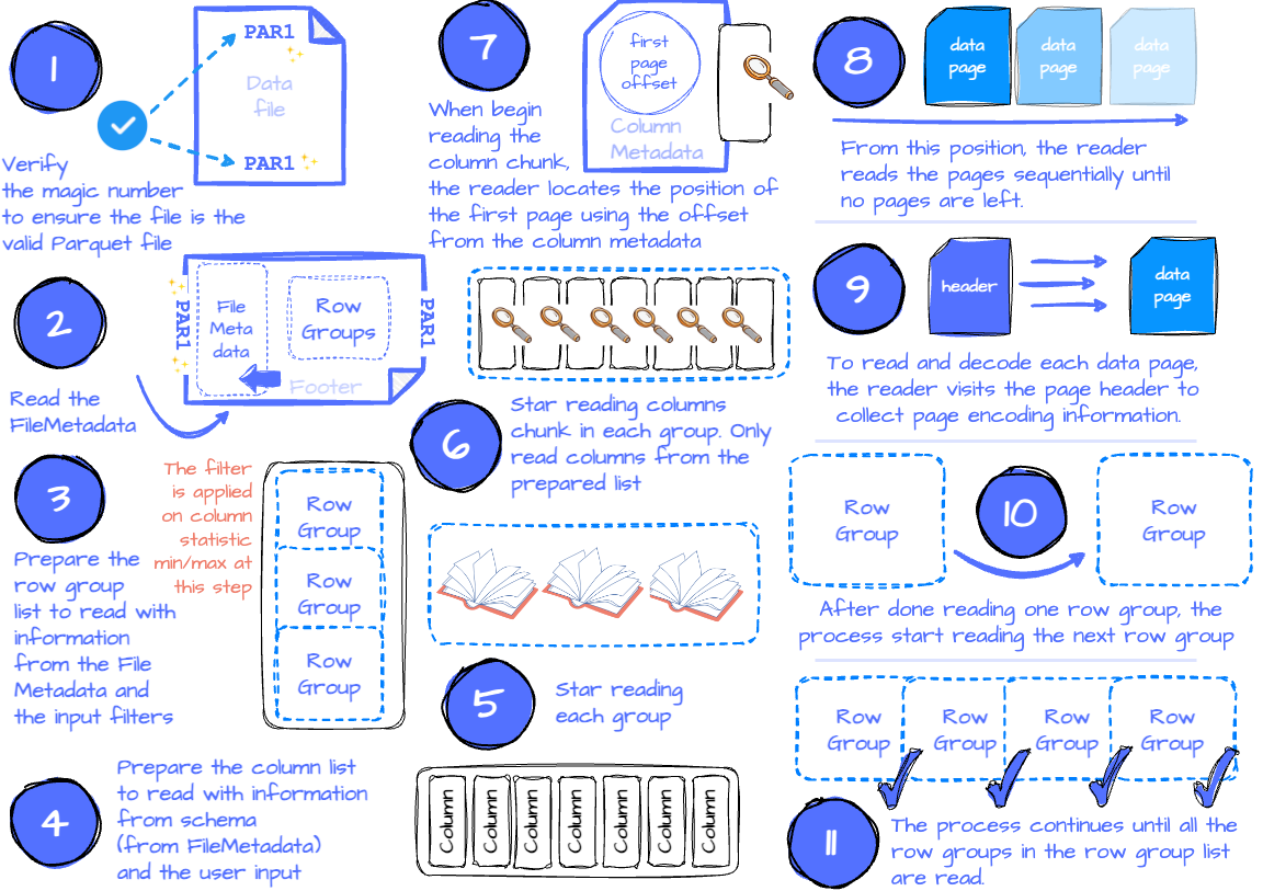 - It then tries to read the FileMetadata from the footer. It extracts information for later use, such as the file schema and the row group metadata.
