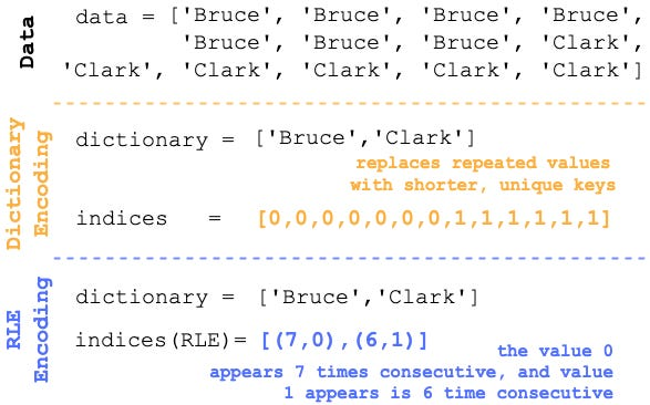 Parquet leverages techniques like dictionary encoding and run-length encoding (RLE) to significantly reduce storage space. After dictionary encoding, the data is further run-length encoded in Parquet.
