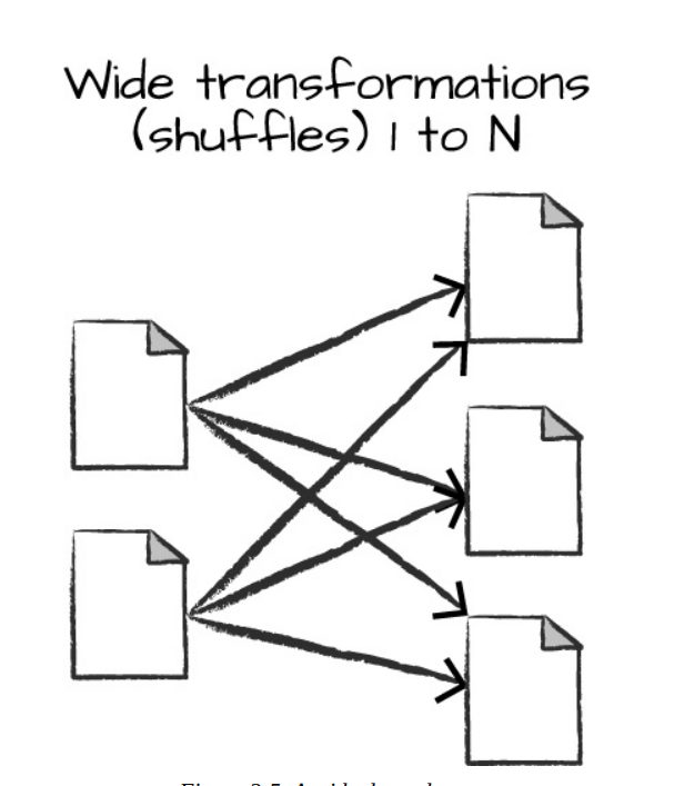 - wide dependencies: the input partition will contribute to many output partitions (shuffle)