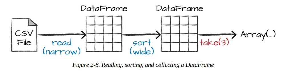 Sort does not modify the DataFrame. We use sort as a transformation that returns a new DataFrame by transforming the previous DataFrame. Let’s illustrate what’s happening when we call take on that resulting DataFrame