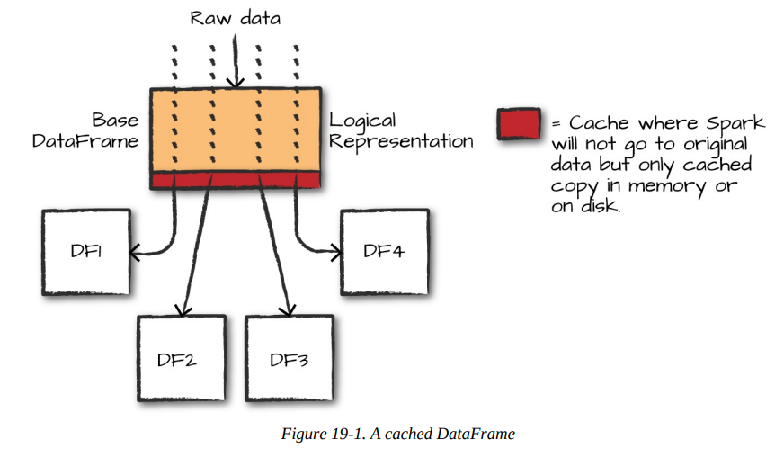 DF4 = DF1.groupBy("count").count().collect()You’ll see here that we have our “lazily” created DataFrame (DF1), along with three other DataFrames that access data in DF1. All of our downstream DataFrames share that common parent (DF1) and will repeat the same work when we perform the preceding code. In this case, it’s just reading and parsing the raw CSV data, but that can be a fairly intensive process, especially for large datasets.