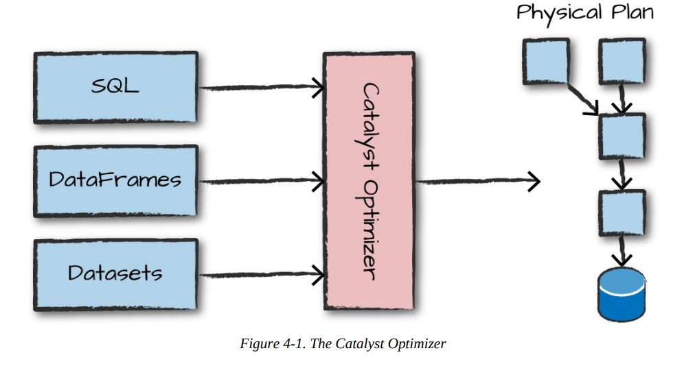 To execute code, we must write code. This code is then submitted to Spark either through the console or via a submitted job. This code then passes through the Catalyst Optimizer, which decides how the code should be executed and lays out a plan for doing so before, finally, the code is run and the result is returned to the user.