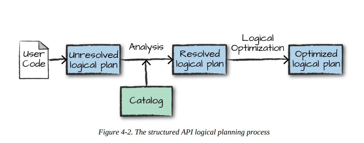Let’s walk through the execution of a single structured API query from user code to executed code. Here’s an overview of the steps: