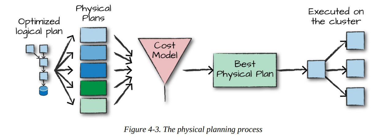 That is specifies how the logical plan will execute on the cluster by generating different physical execution strategies and comparing them through a cost model.