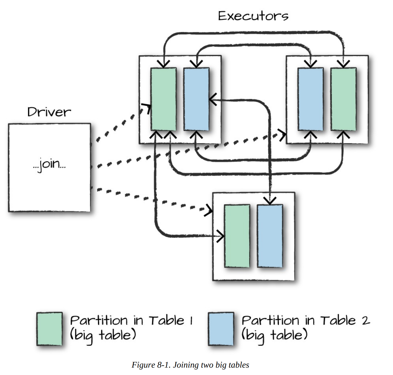 In Figure 8-1, DataFrame 1 and DataFrame 2 are both large DataFrames. This means that all worker nodes (and potentially every partition) will need to communicate with one another during the entire join process (with no intelligent partitioning of data).
